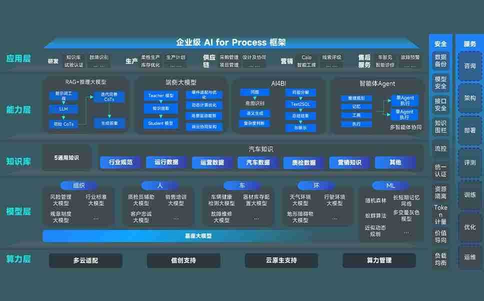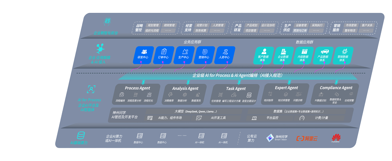 端到端的一站式AI工作空间深度融合了从企业战略规划到日常经营的全流程业务板块,,,,定向解决车企内部领域多、、、、部门多、、、链条长、、场景碎片化等难题,,,支持车企快速构建以AI为核心的生产力写作体系,,,,实现任务执行与AI能力的无缝集成与交互