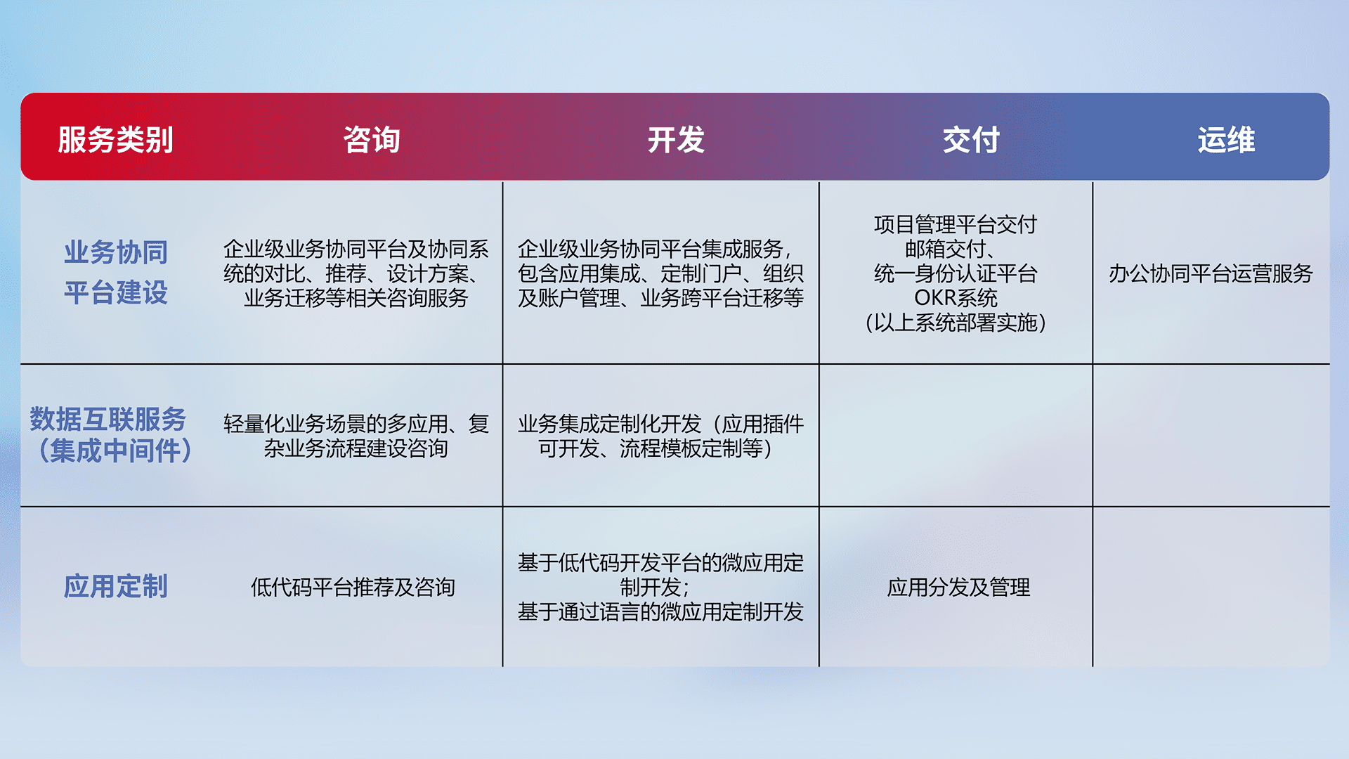 针对钉钉、、、企微、、IDaas等平台级产品提供产品的规划、、方案、、、交付、、、、定制化开发等服务,,实现如统一协同办公、、、、智能客户服务、、、混合会议管理、、、智能数据查询、、、等业务场景,,,实现数字化转型。。。