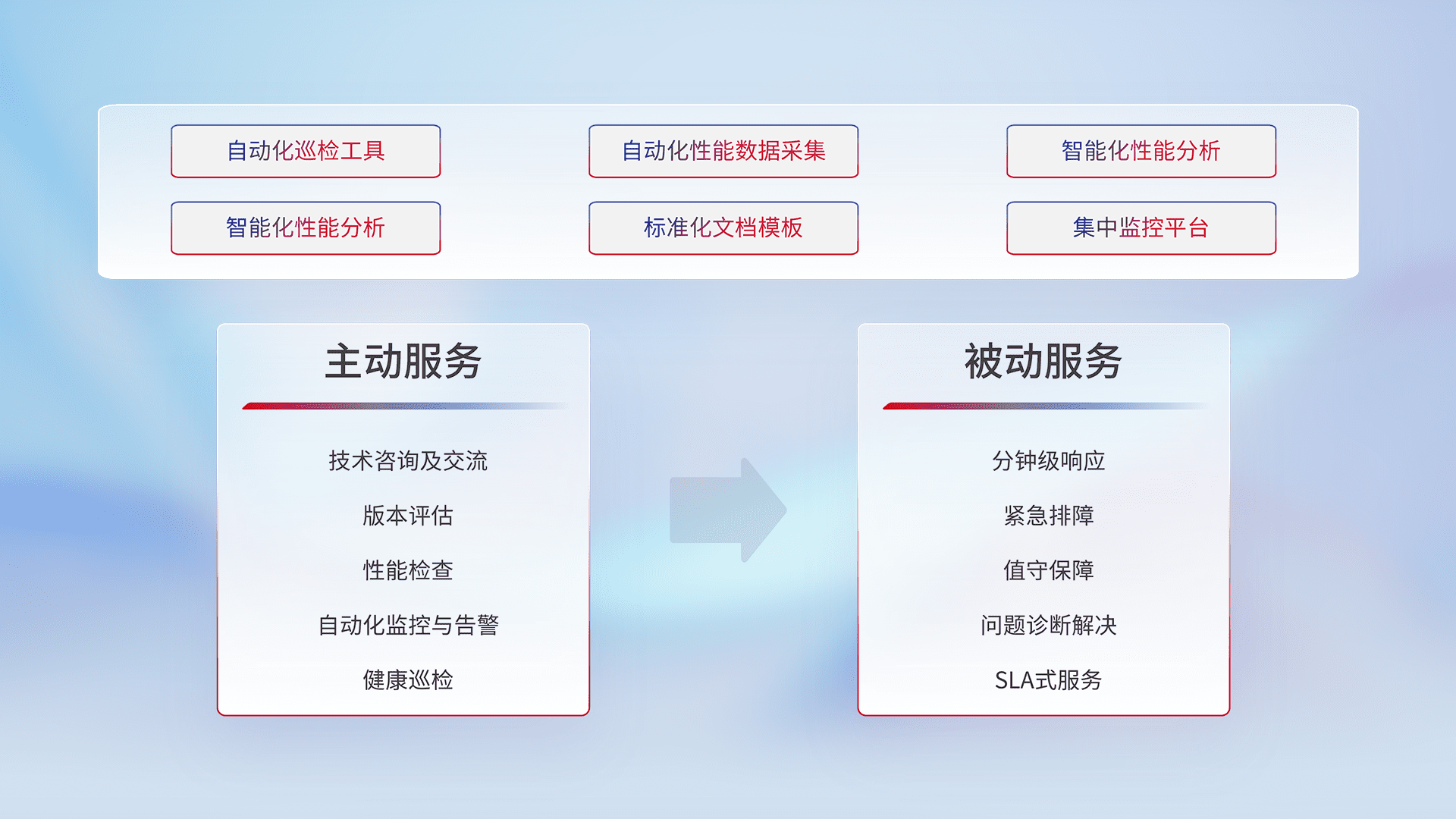 智能化工具和标准化文档,,,保障服务质量,,提供主动服务(包含技术咨询、、版本评估、、、性能检查、、自动化监控与告警、、健康巡检)和被动服务包含(分钟级响应、、、、紧急排障、、值守保障、、问题诊断解决、、、、SLA服务)。。